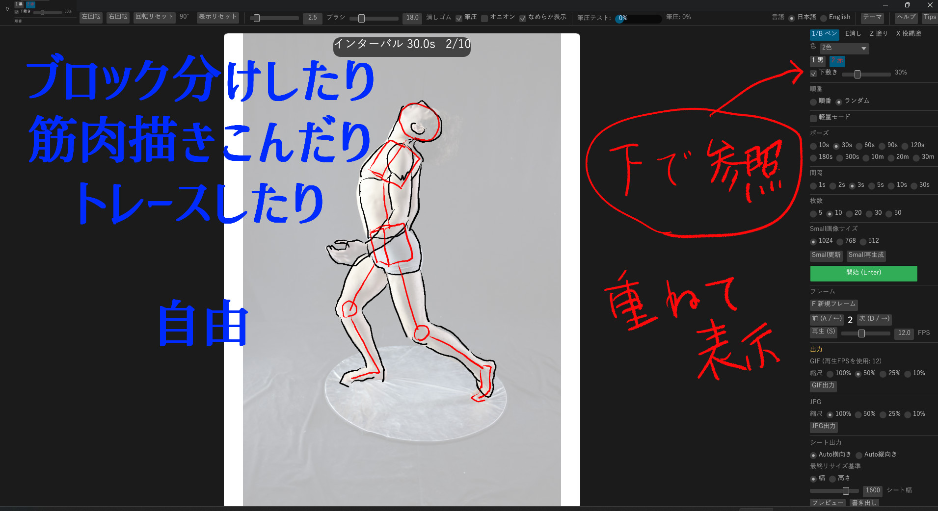 Gescroq is a fast, lightweight tool for croquis, gesture drawing, and sketch practice. Load reference images, run timed sessions, sketch quickly, and export your results as GIF, JPG, or sheets.