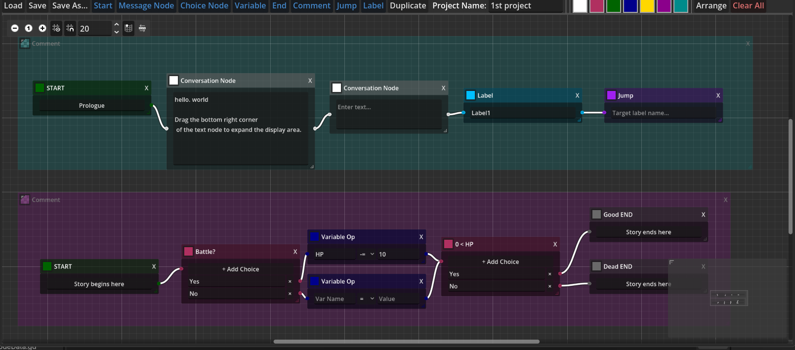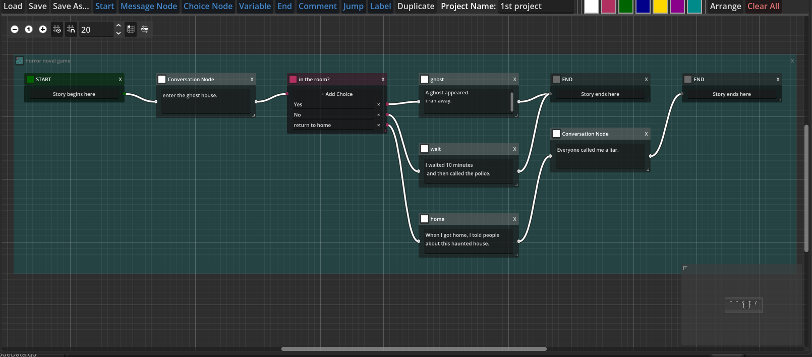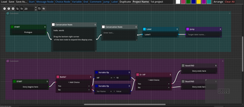 Manage dialogue, branching, and flags visually using nodes.